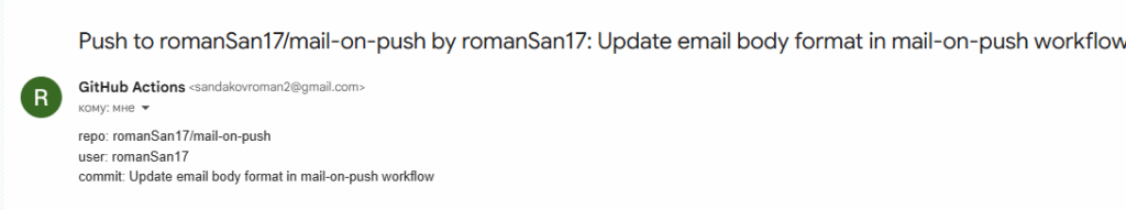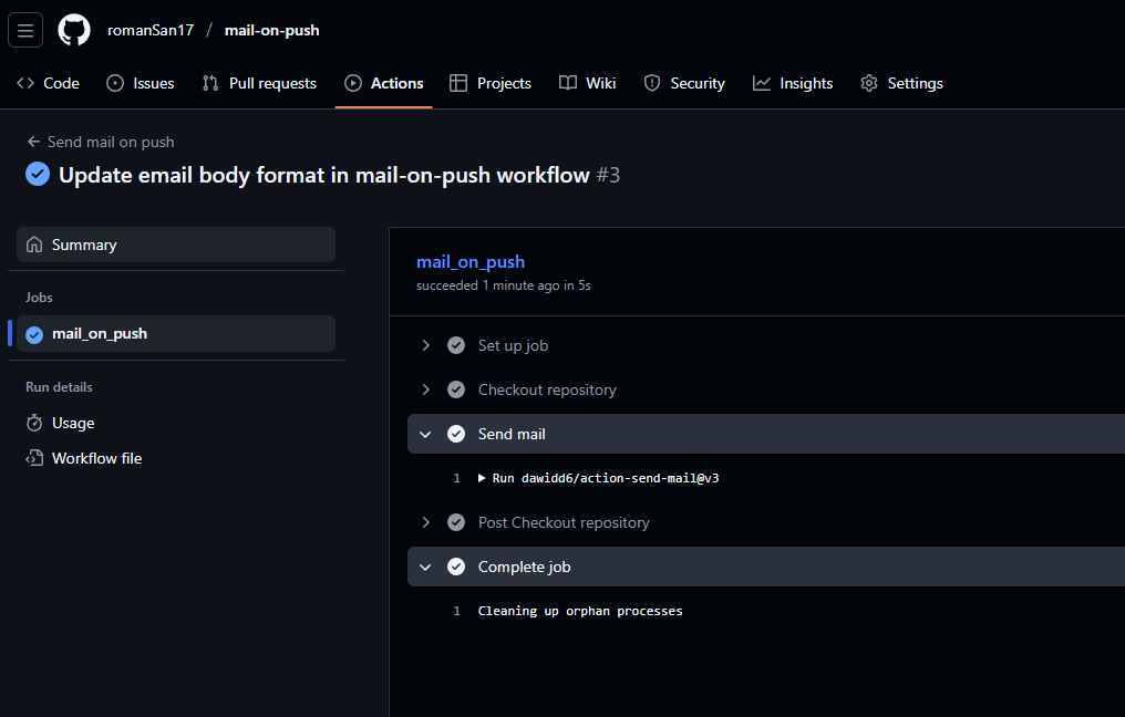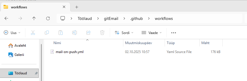Selle töö tulemusena on seadistatud GitHub Actions, mis saadab automaatselt e-posti teate iga kord, kui repositooriumisse tehakse push. See võimaldab saada teateid uute muudatuste kohta otse postkasti, ilma et oleks vaja käsitsi kontrollida.