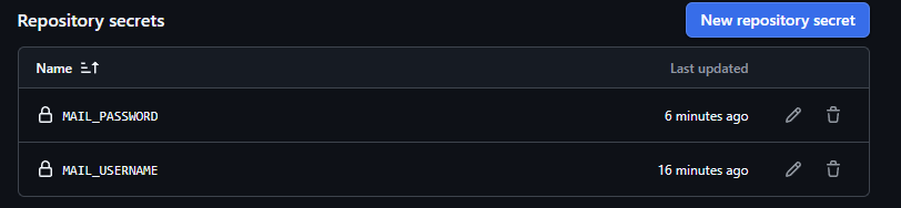 Lisasin MAIL_PASSWORD ja MAIL_USERNAME Github Secretsisse.