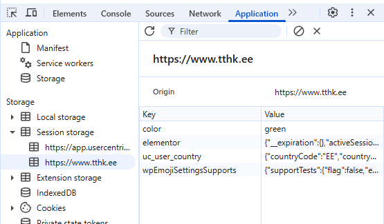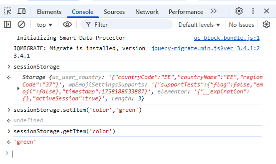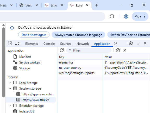 brauseri konsooli kaudu saab määrata mis tahes väärtuse käsuga „sessionStorage.setItem”
