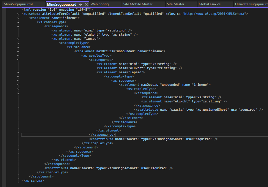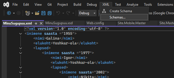 XSD skeemi loomiseks tuleb lihtsalt minna ülemises menüüs vahekaardile „XML” ja klõpsata „luua skeem”, nagu on näidatud pildil.